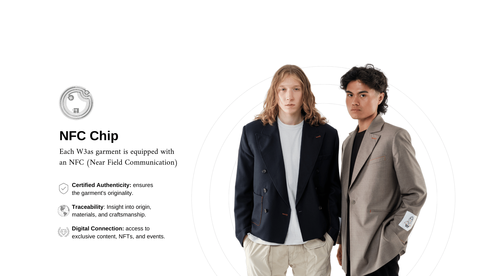 Each garment features an NFC chip, seamlessly merging timeless craftsmanship with innovative technology. A simple tap with your smartphone grants exclusive insights: detailed product information, access to W3as NFTs, or invitations to special client-only events!
